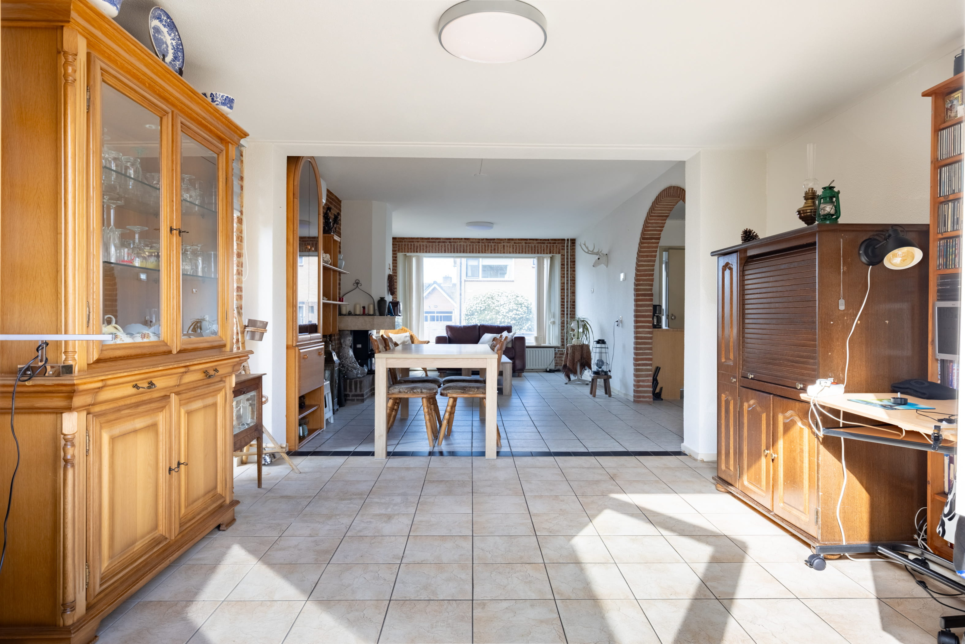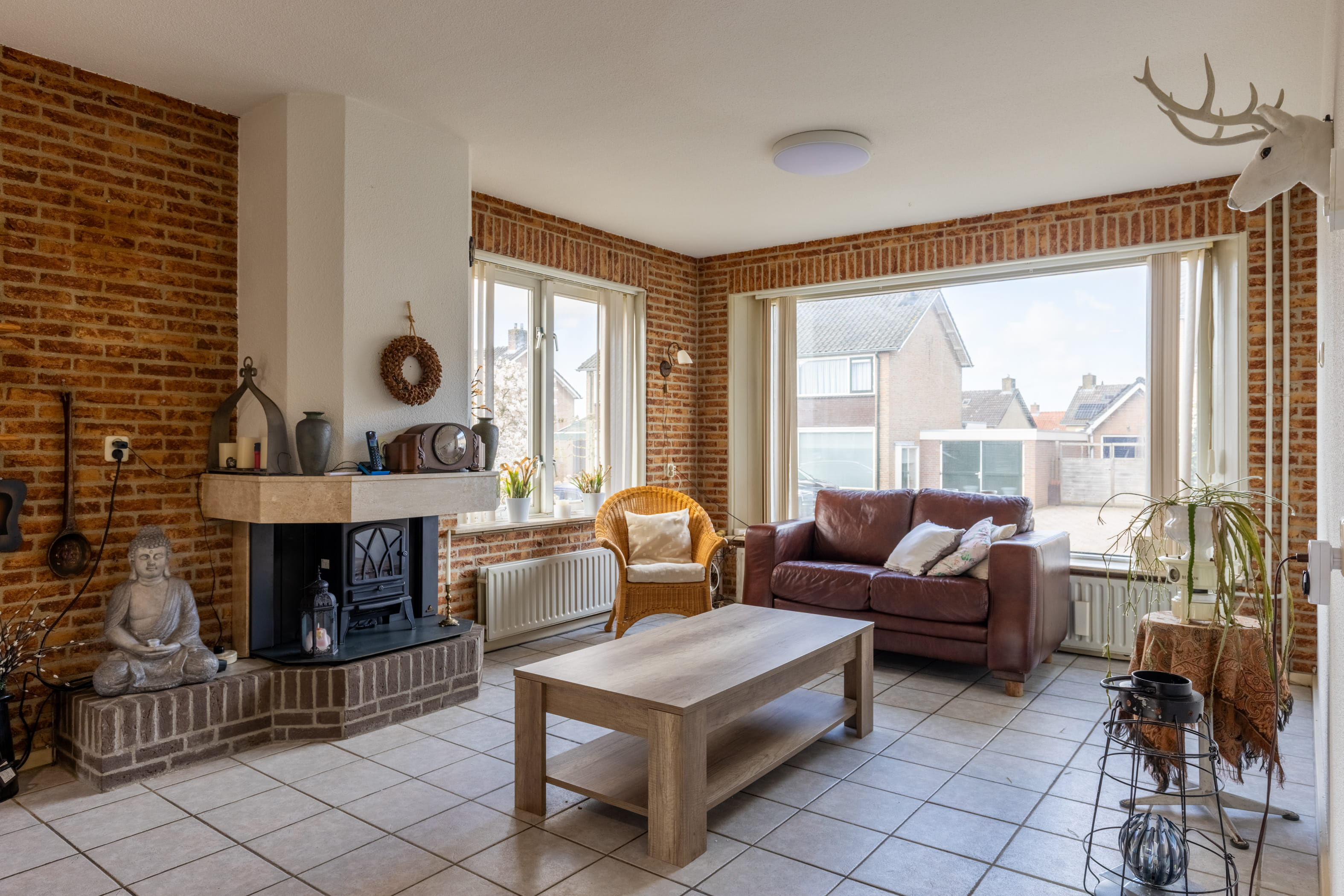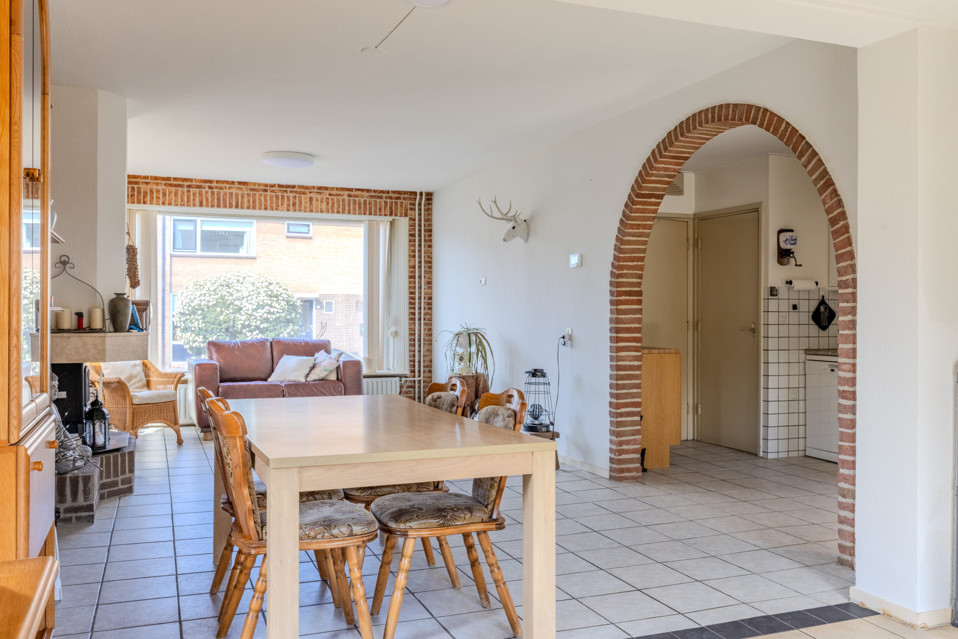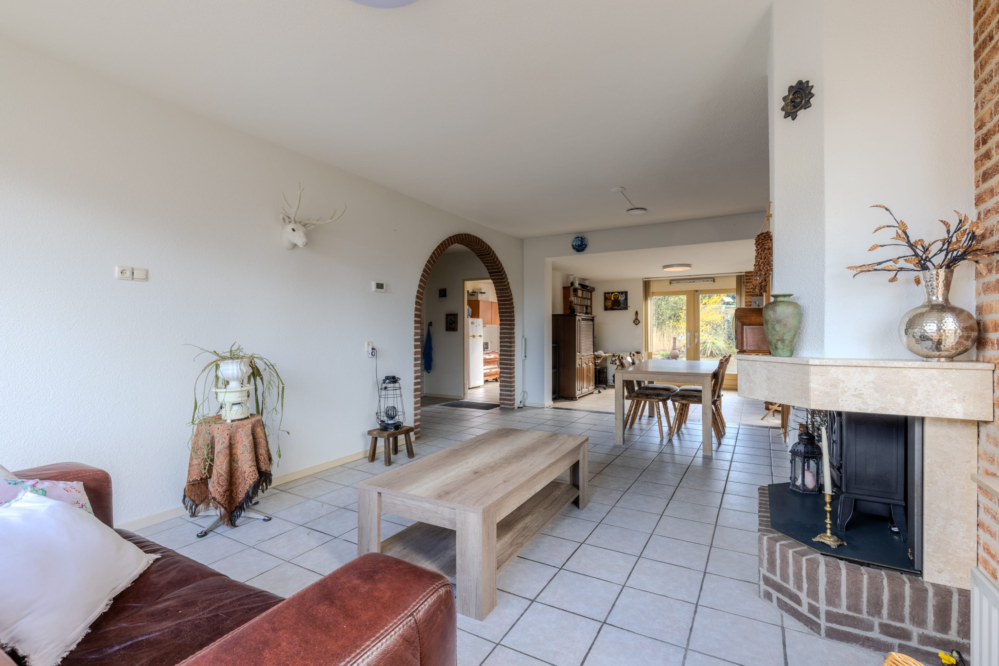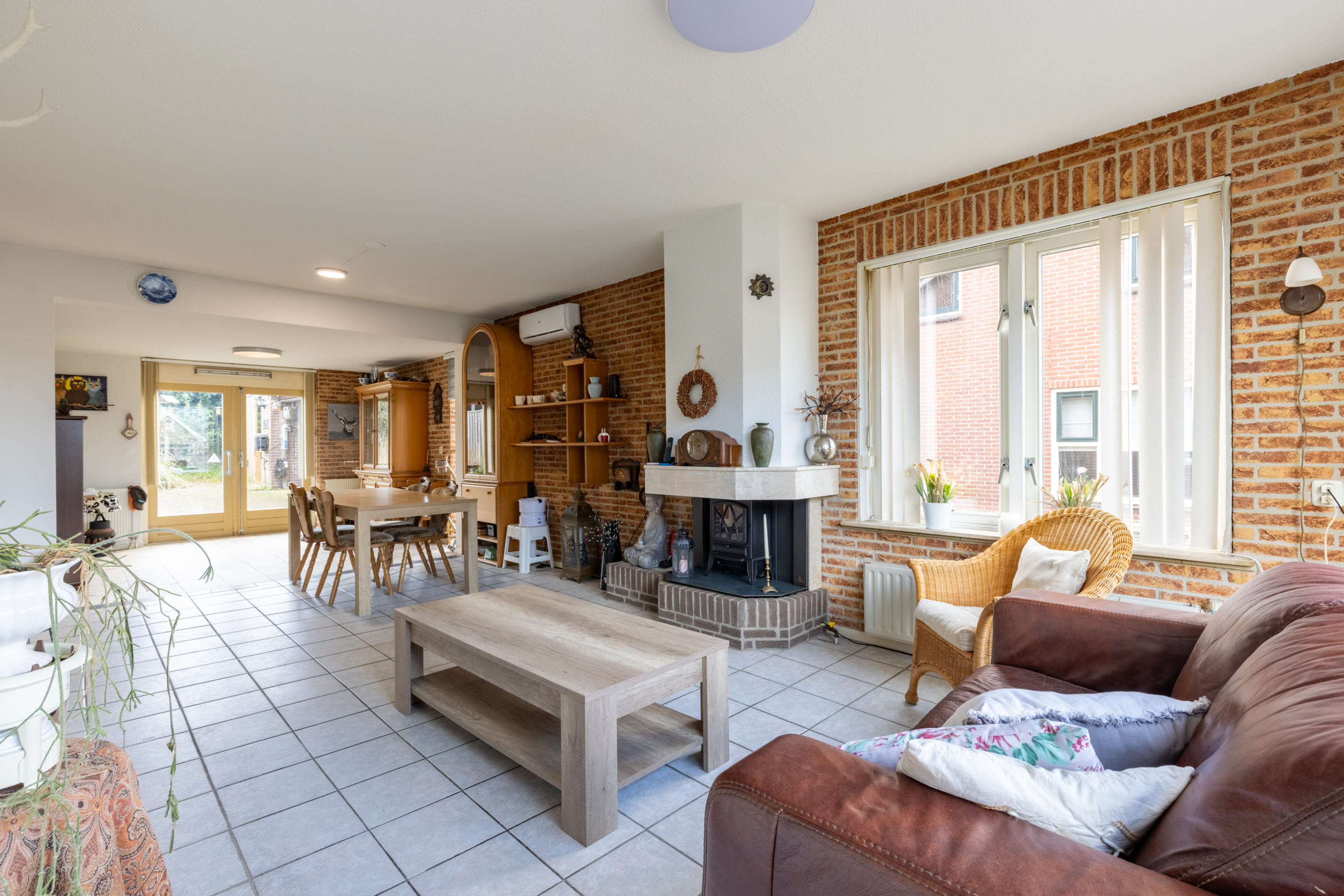 De woonkamer is zonder twijfel het kloppend hart van dewoning. Wat direct opvalt is de royale opzet en de aangename lichtinval dankzijde grote raampartijen. Dit zorgt voor een open en uitnodigende sfeer. Deaanwezige gaskachel brengt niet alleen warmte, maar ook een gezellige en knusseambiance tijdens de koudere maanden. Daarnaast zorgt de airconditioning ervoordat het in de zomer heerlijk koel blijft – optimaal wooncomfort in elk seizoen.