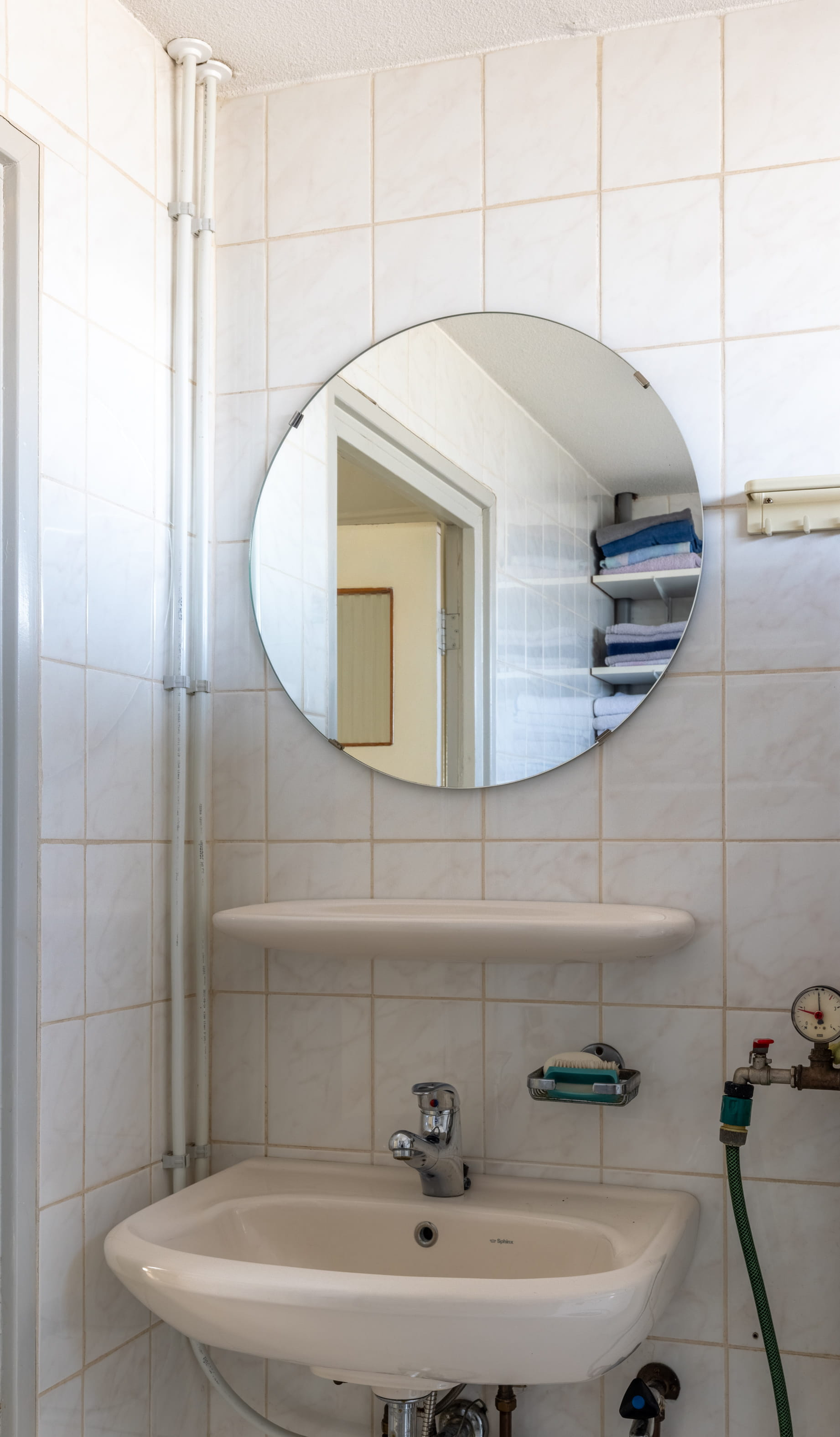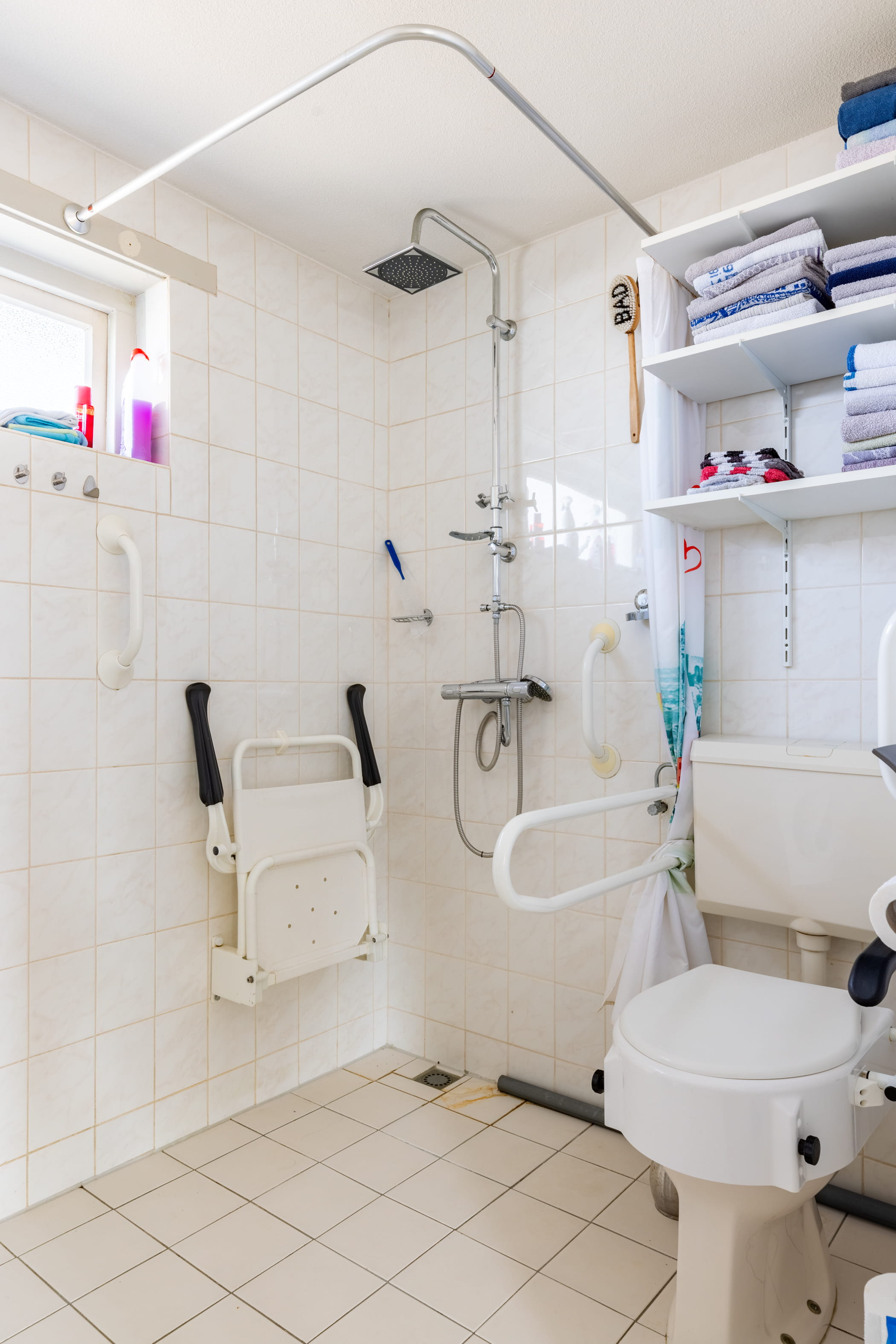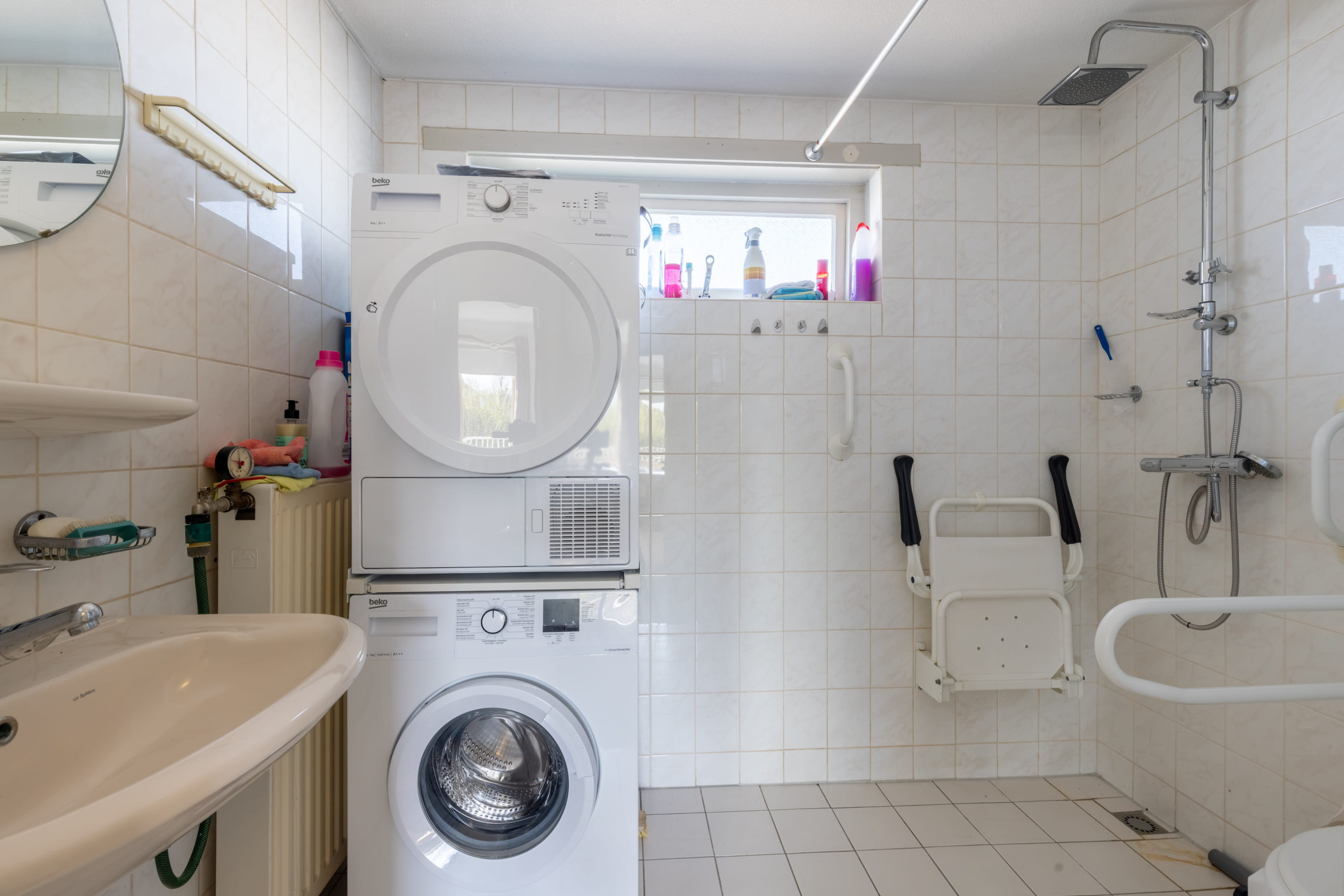 De badkamer is praktisch ingericht en voorzien van eendouche en wastafel. Daarnaast is hier ook de aansluiting voor het witgoedgerealiseerd, wat zorgt voor extra gebruiksgemak.