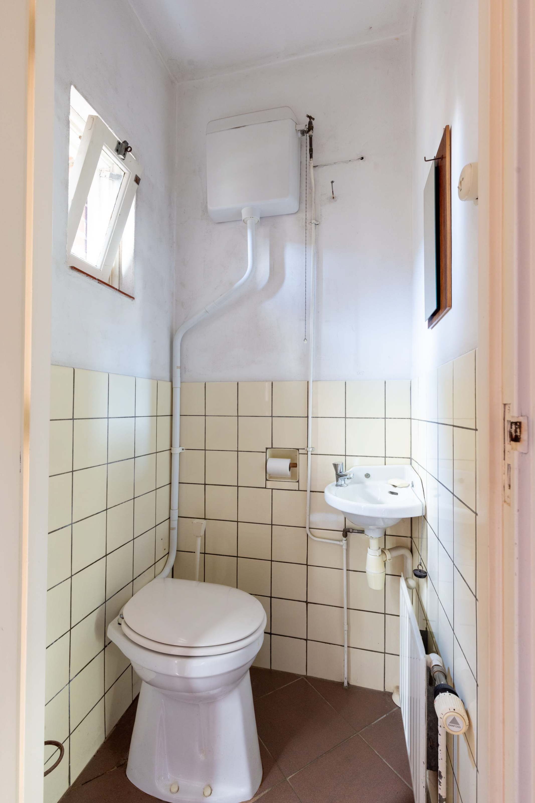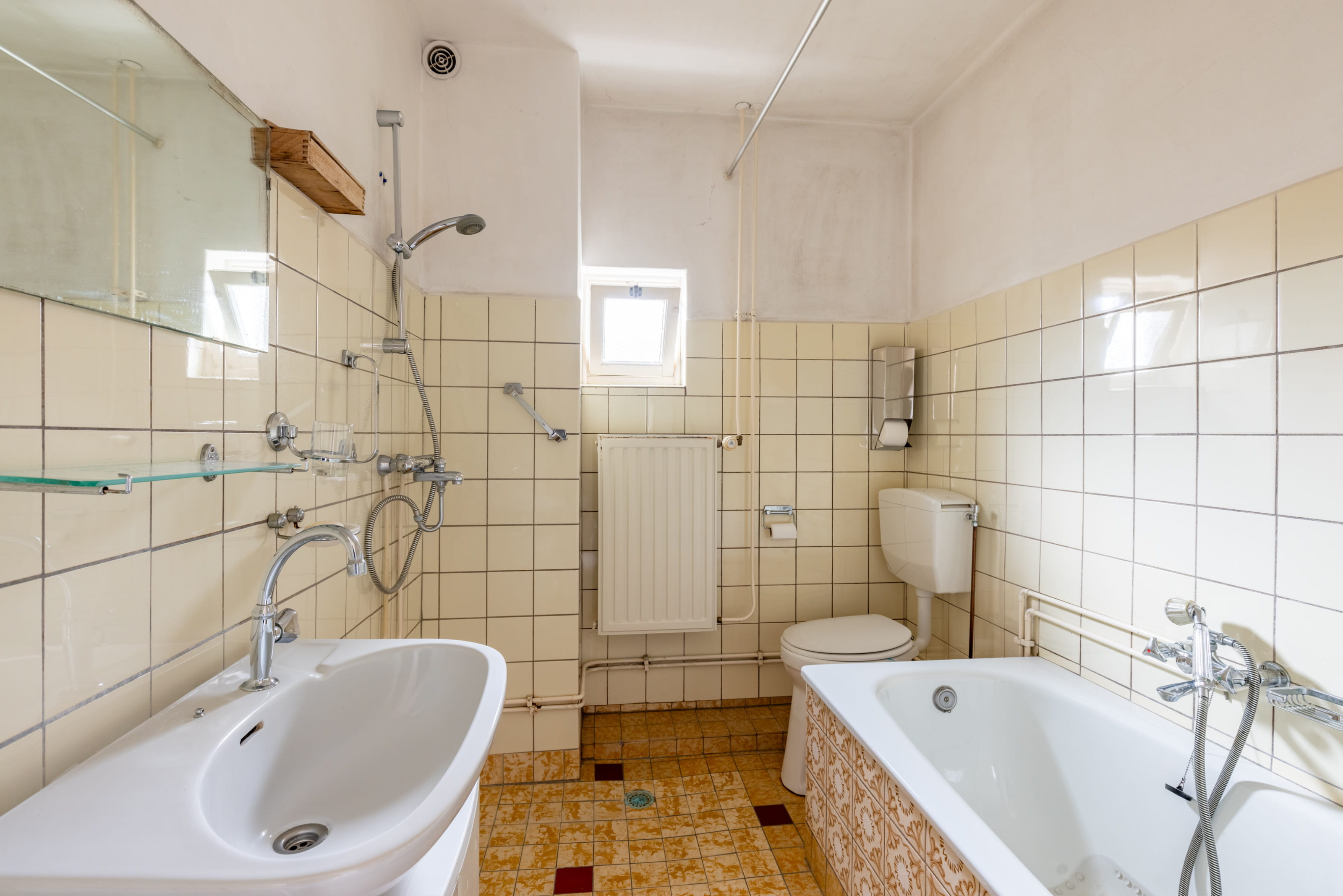 De badkamer is functioneel en biedt mogelijkheden tot modernisering en uitbreiding naar hedendaags comfort.