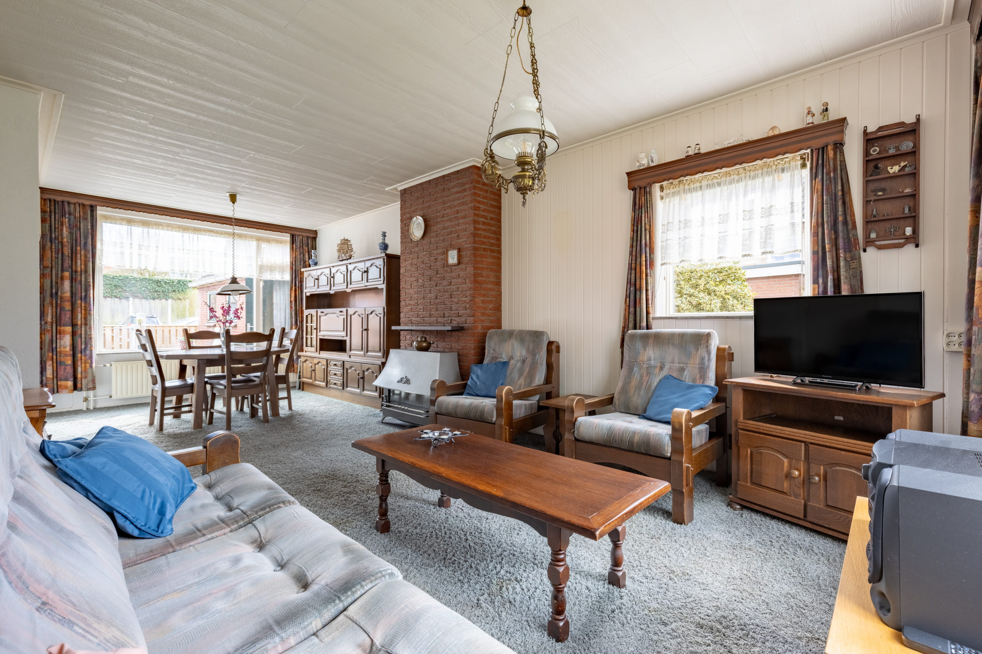 De woonkamer is heerlijk licht dankzij de grote raampartijen aan zowel de voor- als achterzijde. Hierdoor geniet u gedurende de dag van een prettige lichtinval en een ruimtelijk gevoel. De aanwezige gaskachel zorgt voor extra sfeer en warmte.