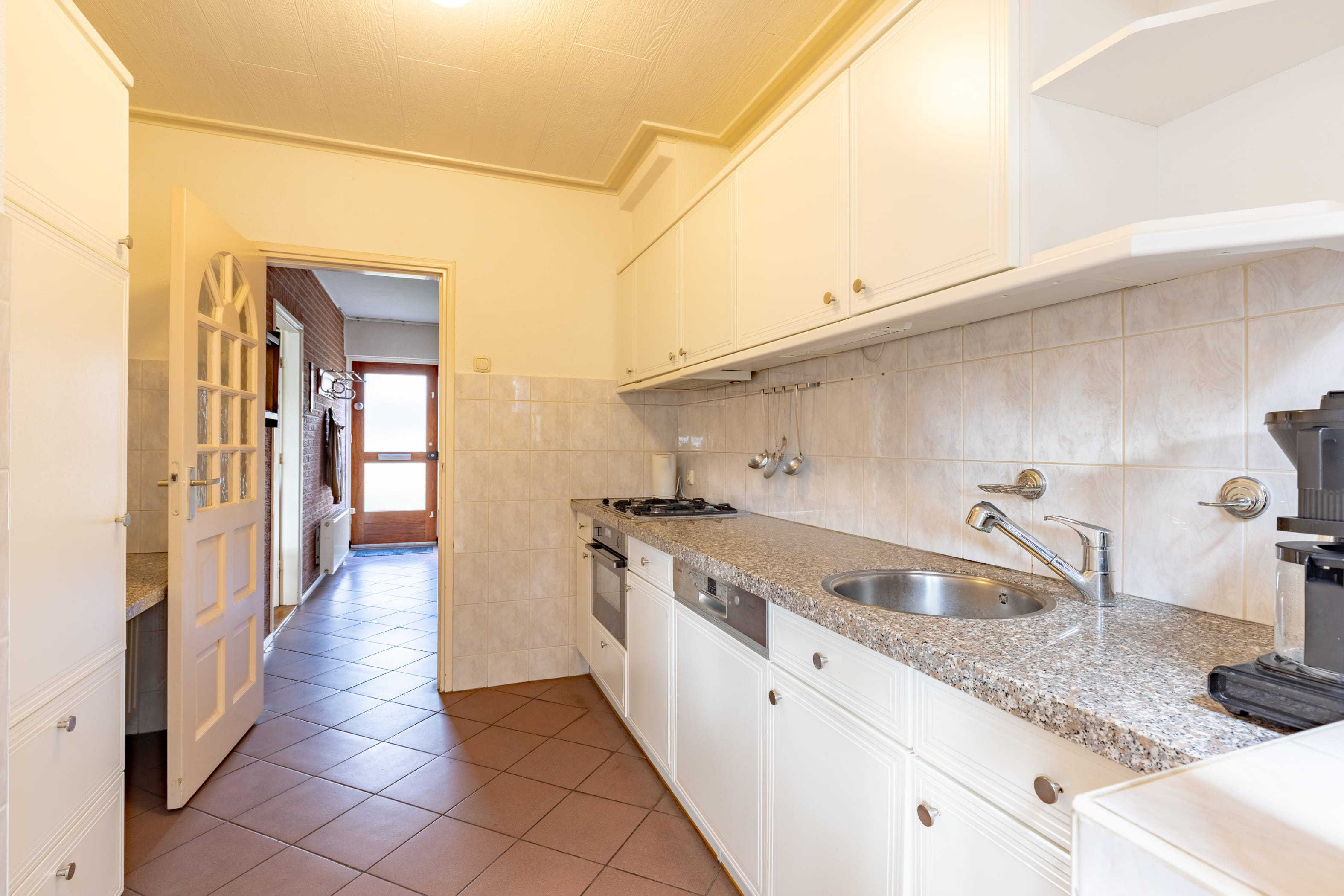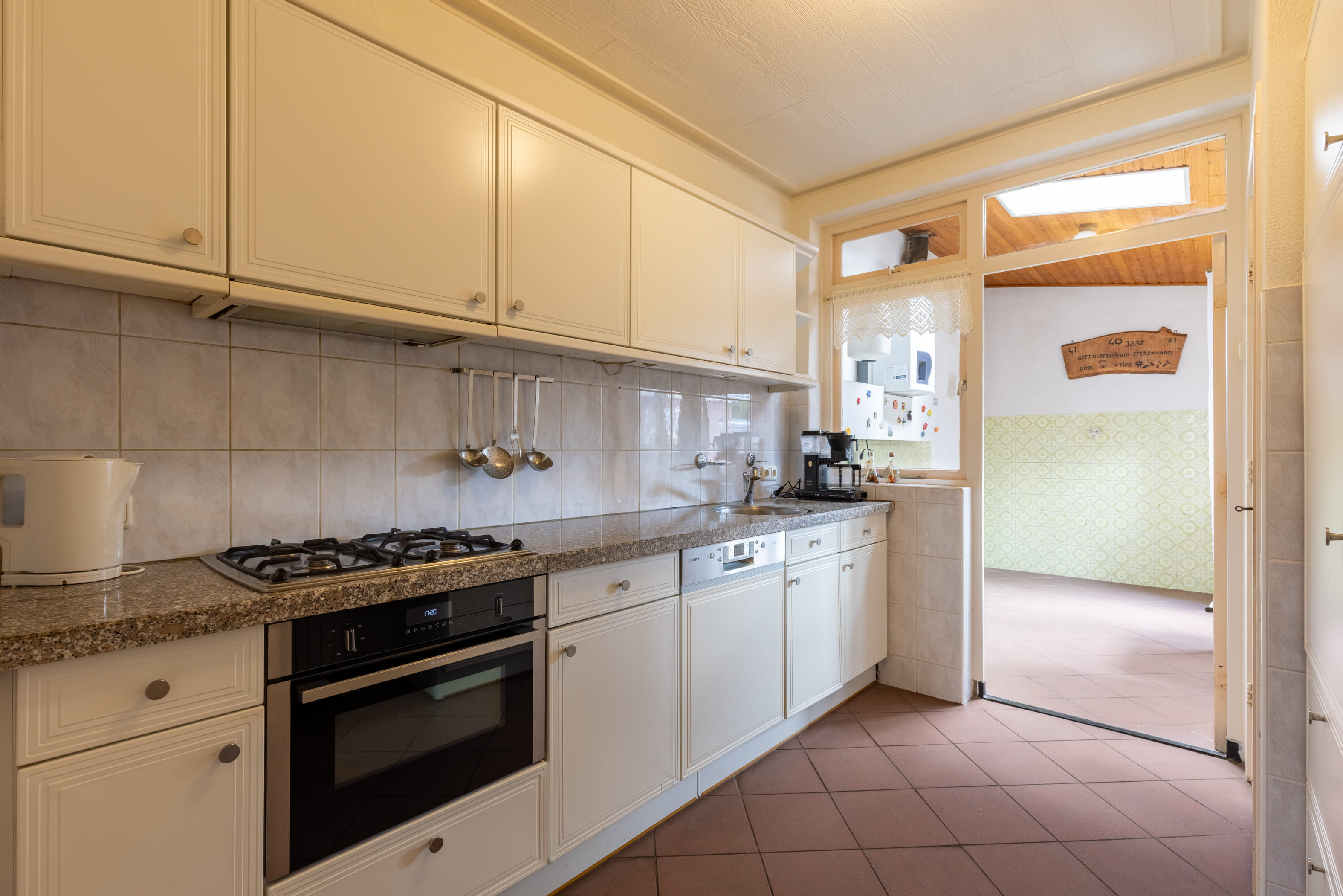 De keuken is voorzien van een keukenblok met inbouwapparatuur en staat in directe verbinding met de bijkeuken. Deze praktische ruimte biedt extra bergruimte en huisvest de aansluiting voor witgoed. Vanuit de bijkeuken heeft u toegang tot de achtertuin.